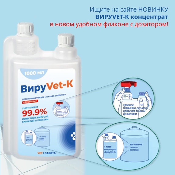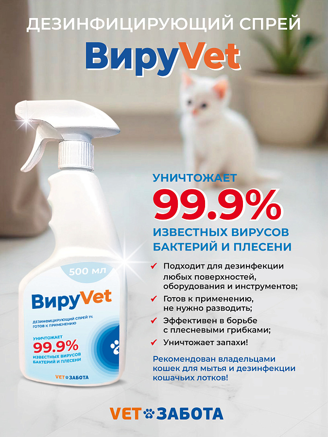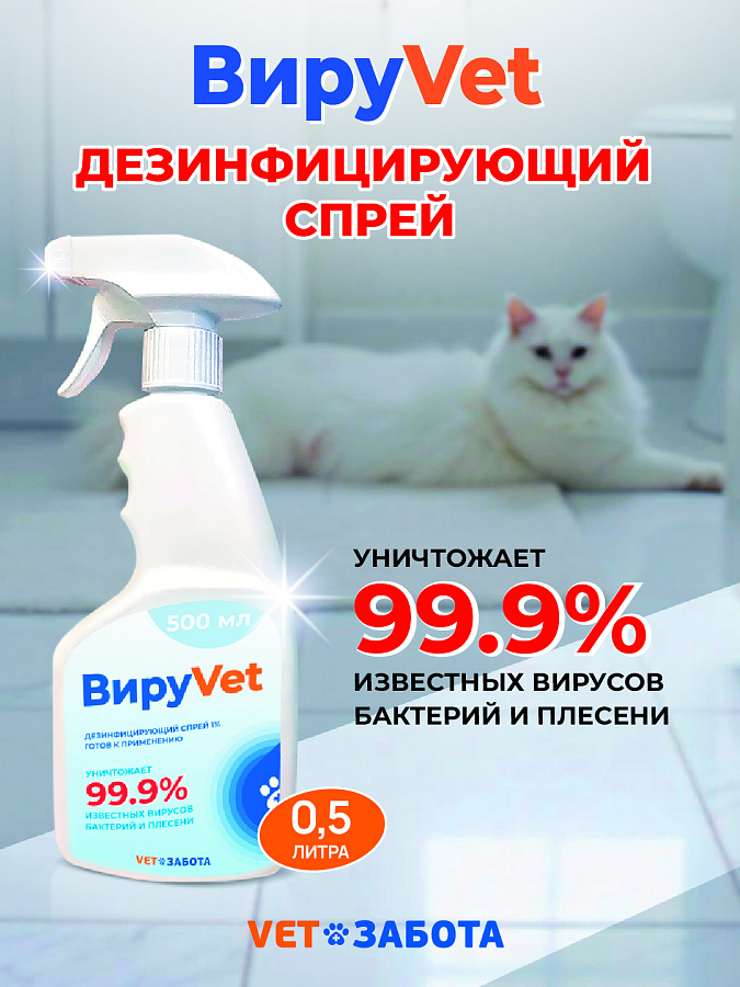 Дезинфицирующее средство ВируVet (ВируВет) обладает выраженным бактерицидным, фунгицидным и противовирусным действием, убирает неприятные запахи, подходит для любых поверхностей, содержит четыре действующих вещества, усиливающие друг друга.