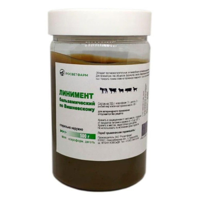 Линимент бальзамический по Вишневскому — это антисептическое и противовоспалительное средство для наружного применения. В ветеринарии используется для лечения инфицированных ран, абсцессов, пролежней и других воспалительных процессов кожи и мягких тканей.
