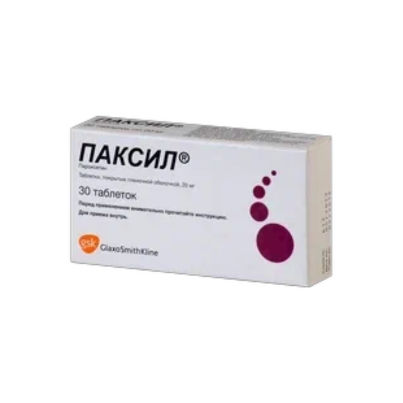Таблетки Паксил содержат пароксетин — антидепрессант из группы селективных ингибиторов обратного захвата серотонина. Дозировка: 20 мг в одной таблетке. Упаковка содержит 30 таблеток.