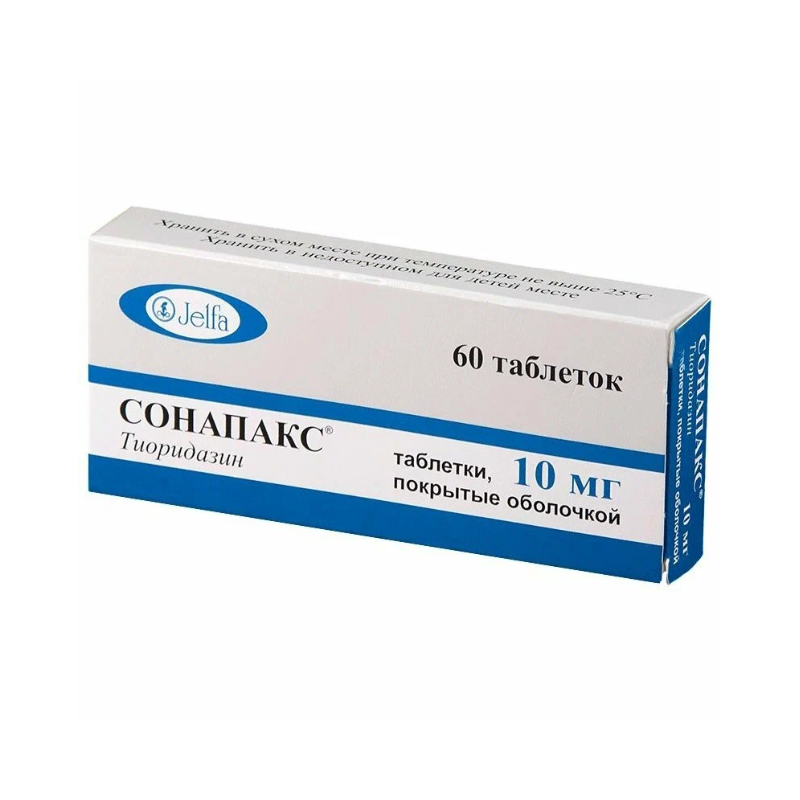 Таблетки Сонапакс содержат тиоридазин — нейролептическое средство из группы фенотиазинов. Дозировка: 10 мг в одной таблетке. Упаковка содержит 60 таблеток.