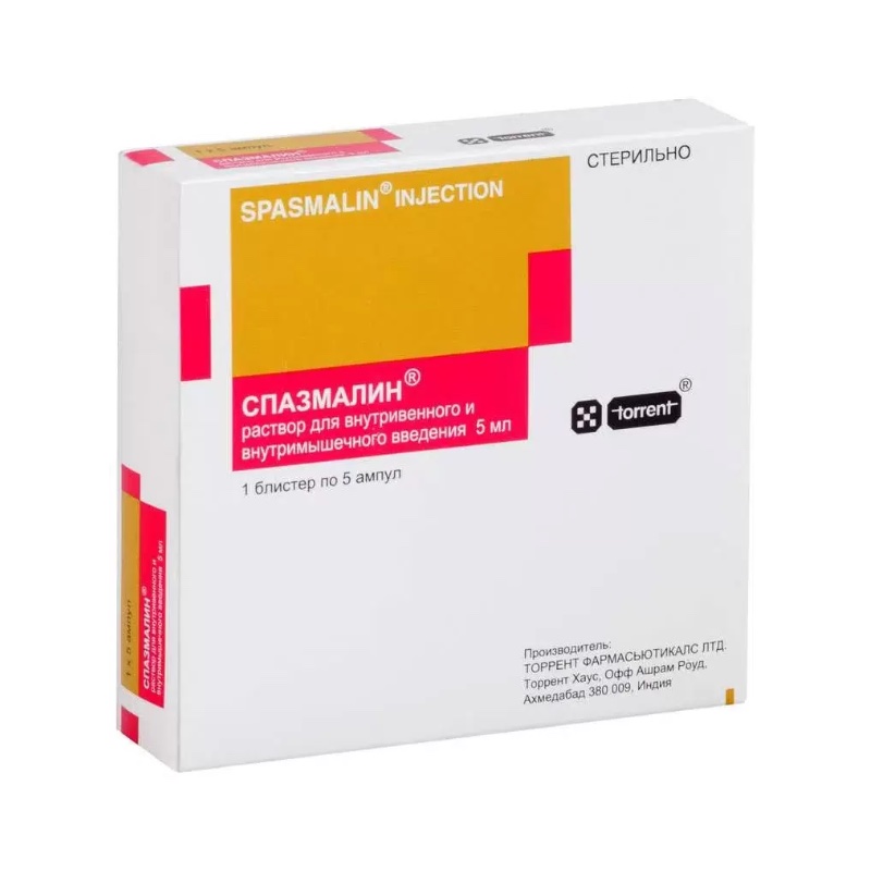 Спазмалин — это раствор для внутривенного и внутримышечного введения, содержащий метамизол натрия (500 мг/мл), питофенона гидрохлорид (0,2 мг/мл) и фенпивериния бромид (0,02 мг/мл), предназначенный для снятия спазмов и боли.
