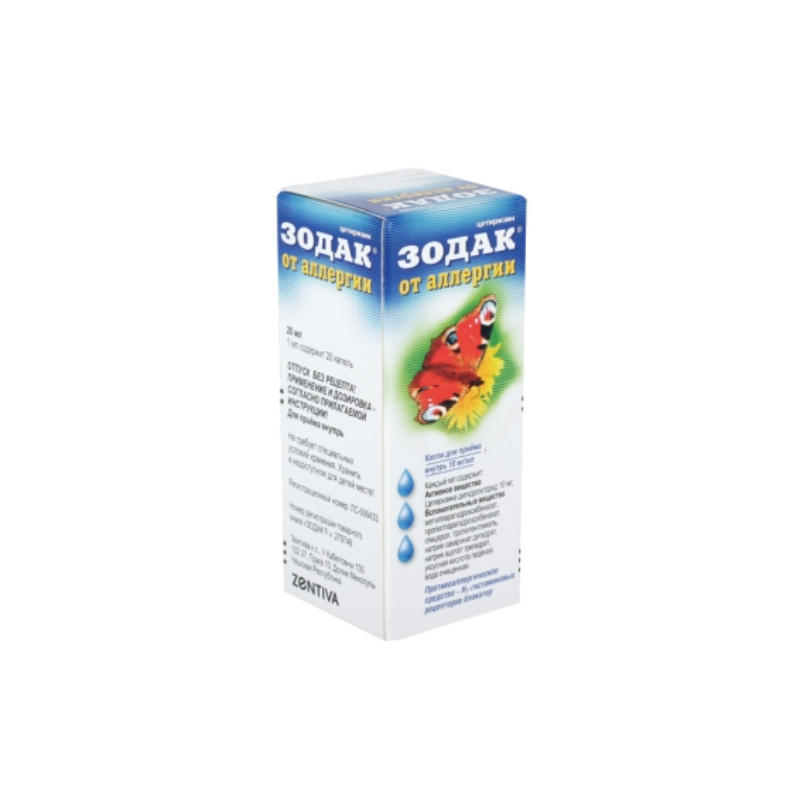 Зодак — это раствор для приема внутрь в форме капель, содержащий цетиризина дигидрохлорид (10 мг/мл), предназначенный для лечения аллергических реакций у людей и животных.